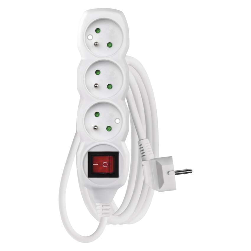 Bílý prodlužovací přívod, 3 zásuvka s vypínačem, délkou 2 m a průřezem vodiče 1 mm2. Vhodný pro maximální zátěž 16 A max.Prodlužovací přívod 2 m na 230 V~ slouží k prodloužení elektrické energie tam, kam pevná zásuvka nedosáhne.Při montáži na stěnu je nutné použít vrut se zápustnou hlavou PZ max. průměr 2,5–3 mm, délka 30–40 mm. V případě použití jiného průměru hrozí poškození plastové části otvoru. Pokud dojde k poškození plastové části otvoru, prodlužovací přívod nepoužívejte.