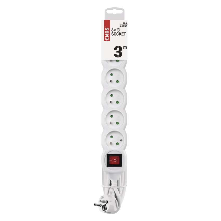Bílý prodlužovací přívod, 6 zásuvka s vypínačem, délkou 3 m a průřezem vodiče 1 mm2. Vhodný pro maximální zátěž 10 A max.Prodlužovací přívod 3 m na 230 V~ slouží k prodloužení elektrické energie tam, kam pevná zásuvka nedosáhne.Při montáži na stěnu je nutné použít vrut se zápustnou hlavou PZ max. průměr 2,5–3 mm, délka 30–40 mm. V případě použití jiného průměru hrozí poškození plastové části otvoru. Pokud dojde k poškození plastové části otvoru, prodlužovací přívod nepoužívejte.