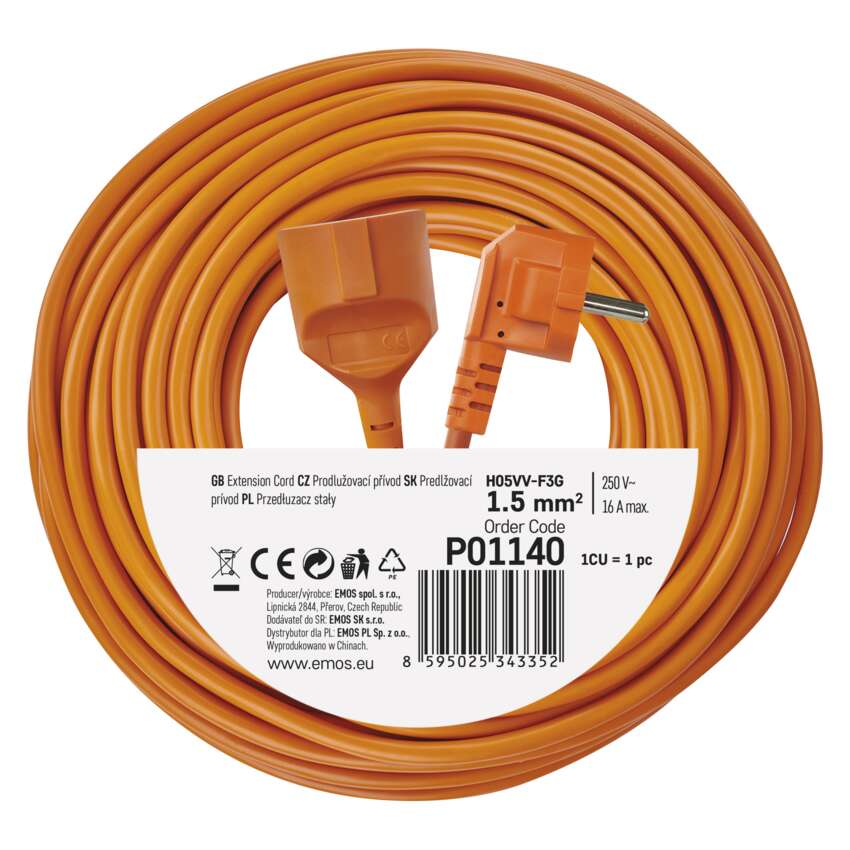 Oranžový prodlužovací přívod s jednou zásuvkou - spojka, délkou 40 m a průřezem vodiče 1,5 mm2. Vhodný pro maximální zátěž 16 A max. Prodlužovací přívod 40 m na 230 V~ slouží k prodloužení elektrické energie tam, kam pevná zásuvka nedosáhne.