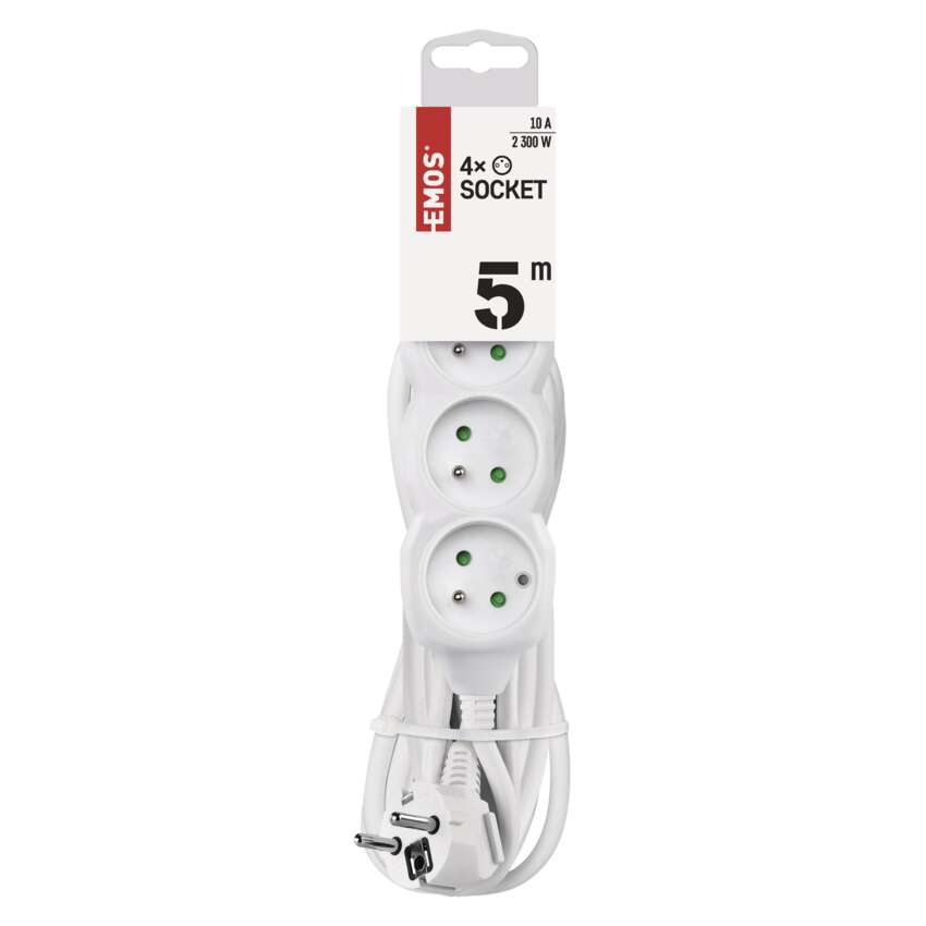 Bílý prodlužovací přívod, 4 zásuvka s délkou 5 m a průřezem vodiče 1 mm2. Vhodný pro maximální zátěž 10 A max.Prodlužovací přívod 5 m na 230 V~ slouží k prodloužení elektrické energie tam, kam pevná zásuvka nedosáhne.Při montáži na stěnu je nutné použít vrut se zápustnou hlavou PZ max. průměr 2,5–3 mm, délka 30–40 mm. V případě použití jiného průměru hrozí poškození plastové části otvoru. Pokud dojde k poškození plastové části otvoru, prodlužovací přívod nepoužívejte.