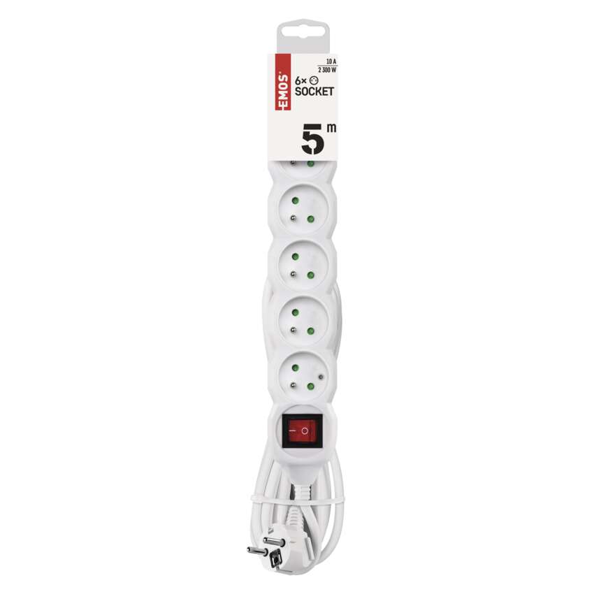 Prodlužovací kabel 5 m / 6 zásuvek / s vypínačem / bílý / PVC / 1 mm2