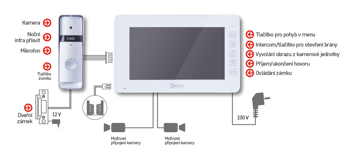 Vysoce kvalitní model videotelefonu H2015 staví na velmi jednoduchém vzhledu s tenkým bílým rámečkem okolo LCD obrazovky s dotykovými tlačítky. Tak na stěně nepůsobí nepatřičně a skvěle zapadne do vaší domácnosti. Tlačítky lze kromě vyvolání komunikace ovládat bránu či elektrický dveřní zámek. Monitor má možnost napájení přímo z 230V (šňůra s vidlicí) nebo adaptérem na 12V. Antivandal kovové provedení venkovní kamerové jednotky zajistí odolnost před nepříznivými vlivy počasí a ochrání i proti poškození nezvanými hosty. U tohoto videotelefonu H2015 je možnost připojení externích CCTV kamer. Videotelefon vás překvapí snadnou instalací i příznivou cenou.