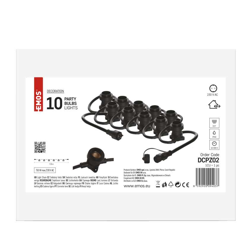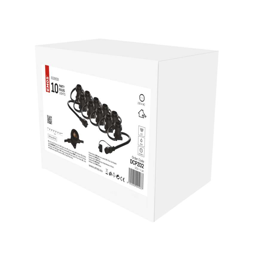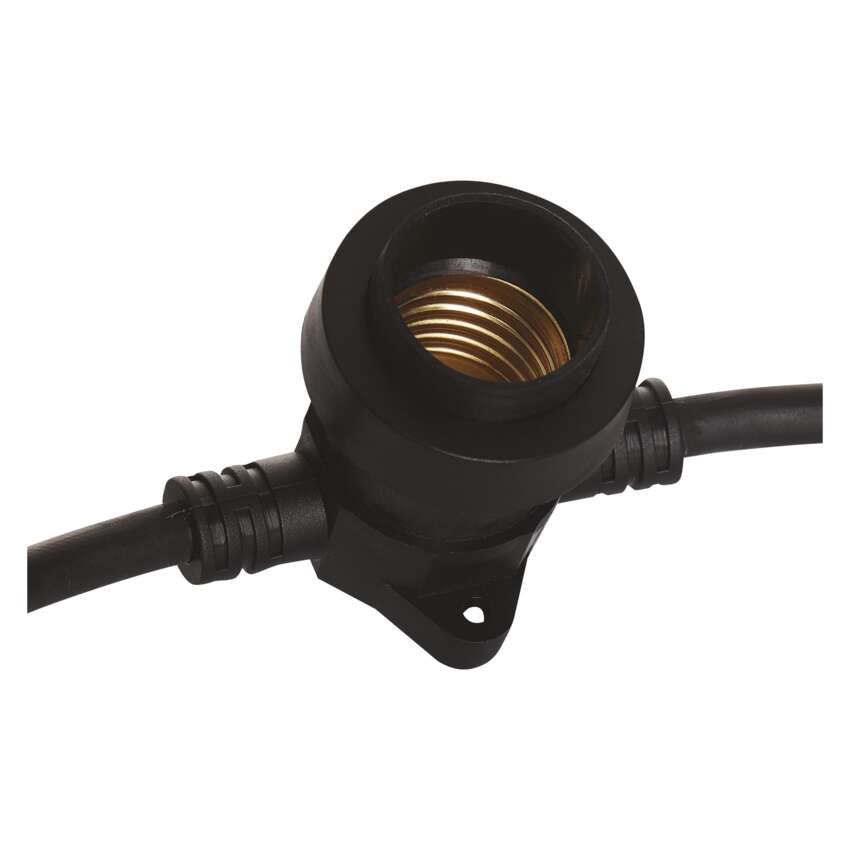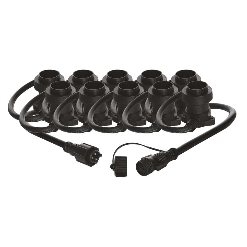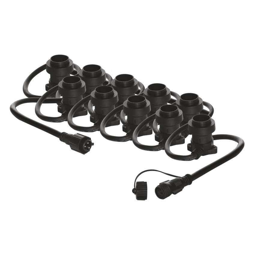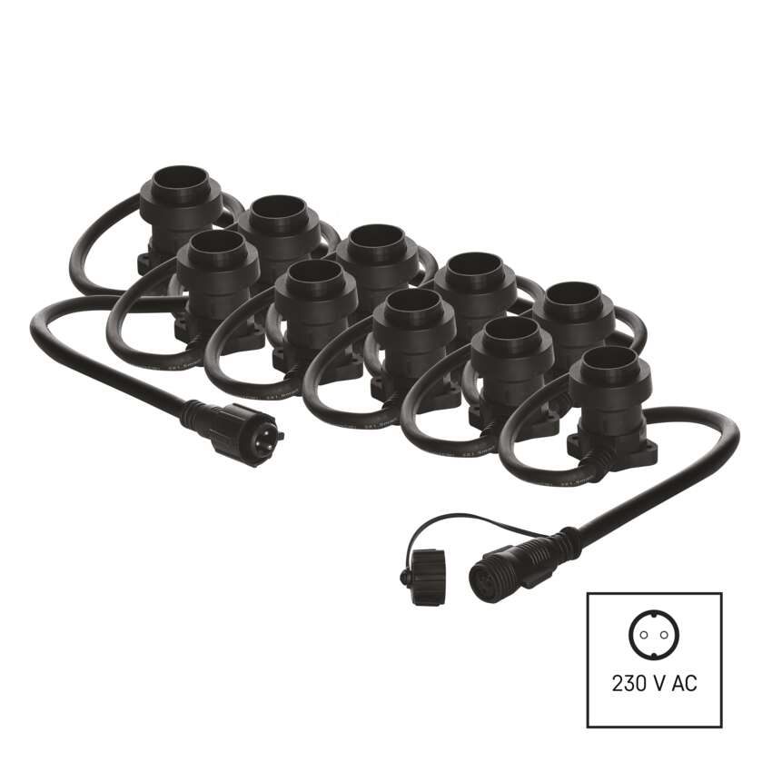 Spojovací světelný řetěz je vybaven paticemi E27, do kterých můžete umístit žárovky libovolné barvy, tvaru a příkonu až do maximální hodnoty 750 W. Pouhou výměnou žárovek můžete doladit útulnou atmosféru na balkoně, terase, venkovních oslavách, svatbách, kulturních akcích apod. Propojení spojovacího světelného řetězu s přívodním napájecím kabelem (není součástí balení) nebo jinými světelnými řetězy je dílem okamžiku díky vodotěsným šroubovacím spojkám. Řetěz hravě zvládne i nepřízeň počasí – žárovková objímka je vybavena gumovým těsněním, které přilne k instalované žárovce po celém jejím obvodu a zabraňuje tak průniku vody.