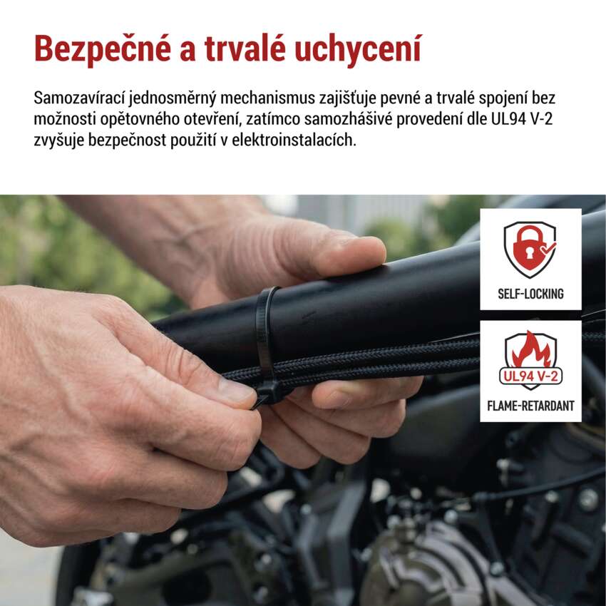 Stahovací pásky EMOS jsou navrženy pro rychlé a bezpečné stažení svazku s důrazem na pevnost spoje a provozní jistotu. Samojistný uzamykací mechanismus umožňuje plynulé dotažení a následné spolehlivé zajištění bez rizika samovolného uvolnění při standardním použití.