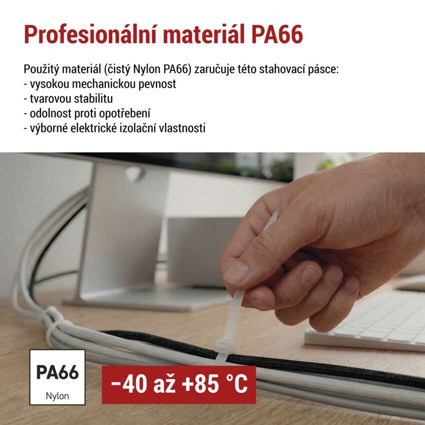 Pásky jsou vyrobeny z technického polyamidu PA66, který je v této oblasti standardem pro svou vysokou mechanickou odolnost, rozměrovou stabilitu a dobrou provozní životnost. Materiál je zároveň bezhalogenový a splňuje klasifikaci hořlavosti UL94 V-2. Tento materiál je vhodný pro široké spektrum aplikací, ve kterých je kladen důraz na spolehlivost spoje a stabilní vlastnosti při dlouhodobém používání.