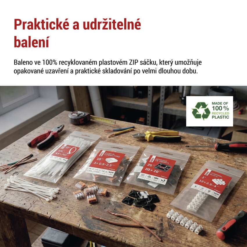 Stahovací pásky EMOS jsou dodávány v opakovaně uzavíratelném sáčku se ZIP systémem, který usnadňuje manipulaci při práci i následné skladování. Máte tak pásky vždy přehledně uložené a okamžitě k dispozici bez zbytečného rozsypání nebo ztrát.