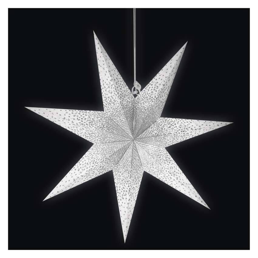 Vánoční hvězda papírová závěsná se stříbrnými třpytkami ve středu, bílá, 60 cm, vnitřní