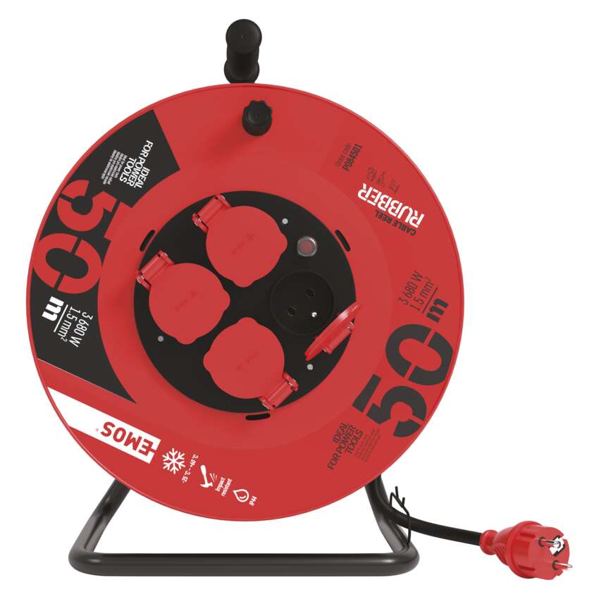 Gumový prodlužovací kabel na bubnu - 4 zásuvka s délkou 50 m, průřezem vodiče 1,5 mm2 a tepelnou pojistkou, odolný proti stříkající vodě. Ve všech zásuvkách je fáze orientovaná vlevo. Vhodný pro maximální zátěž 16 A max. / 3680 W při plně rozvinutém stavu a 4,8 A max. / 1100 W navinutý. Kvalitní gumový naviják prodlužovacího přívodu. Je ideální pro prodloužení napájecí sítě 230V~. Jeho výhodou je pohodlná manipulace díky bubnu.