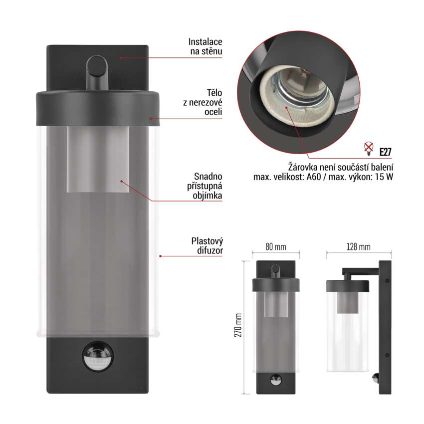Zahradní nástěnné svítidlo ZALA, čidlo soumraku, 12,8 × 8 × 28 cm, 1 × E27, 15 W